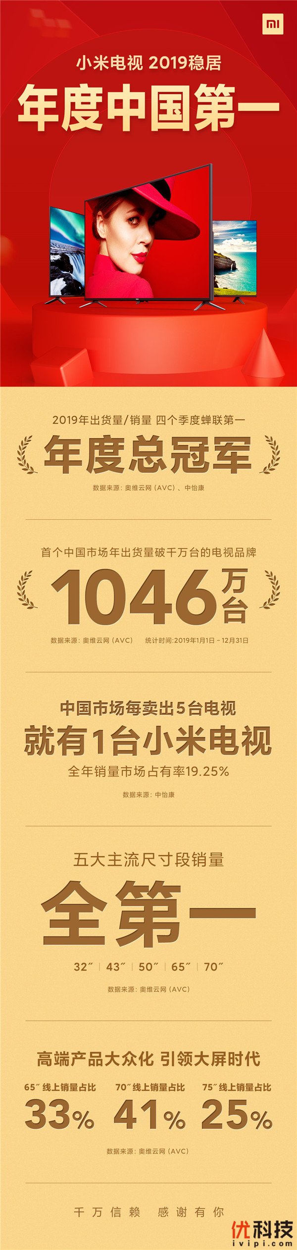 2020年2月,中国两大权威调研机构奥维云网、中怡康的数据显示:在过去的2019年,小米电视出货量、销量双双稳居年度中国第一,其中年出货量达到1046万台,成为中国市场史上首个年出货量破千万的电视品牌。值得一提的是,小米电视去年实现了出货量、销量连续4个季度中国第一,最终稳获年度总冠军,尤其在65英寸、70英寸等大尺寸市场上,小米电视线上市场份额更是超过三成,持续引领大屏电视时代。