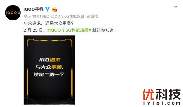 经过一段时间的预热,iQOO 3的主要配置相信大家已经有所了解。对于社交网络上的调侃言论“iQOO 3发布会就差价格了”来说,其实还有很多没有被曝光的黑科技等待我们去发现。今天,iQOO官博继续放出态度海报:“小众追求与大众审美注定二选一?”,结合放出的外观视频,之前备受好评的压感按键也得到保留,iQOO 3的真实面目已经浮出水面。