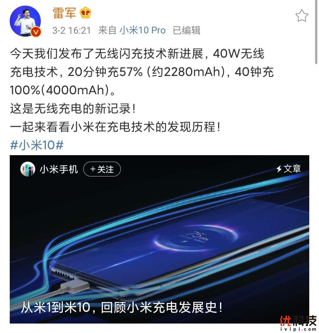雷军发40瓦无线闪充 小米工程师当选无线充电标准联盟工作组联席主席