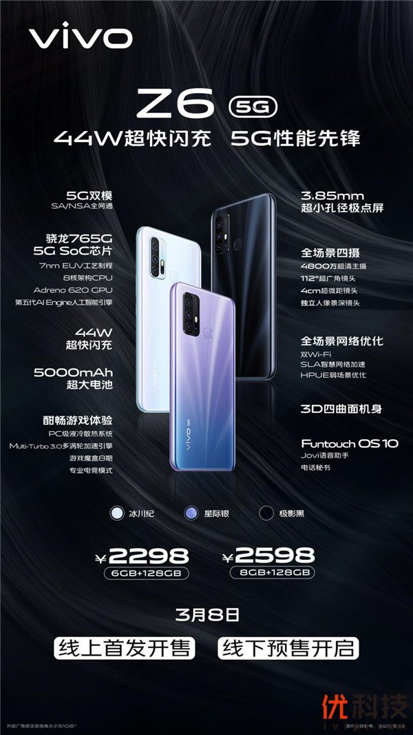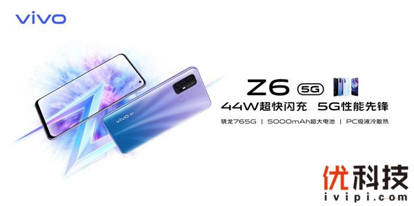 vivo Z6面向青年人群,聚焦于强悍性能与流畅体验,采用高通首款5G SoC芯片——骁龙765G、配备5000mAh大容量电池、支持44W 超快闪充、拥有PC级超级液冷散热系统和超小孔径极点屏。vivo Z6将为更多用户带来优质的5G体验,其将于3月8日在线上首发开售,线下同步开启预售,售价2298元起。