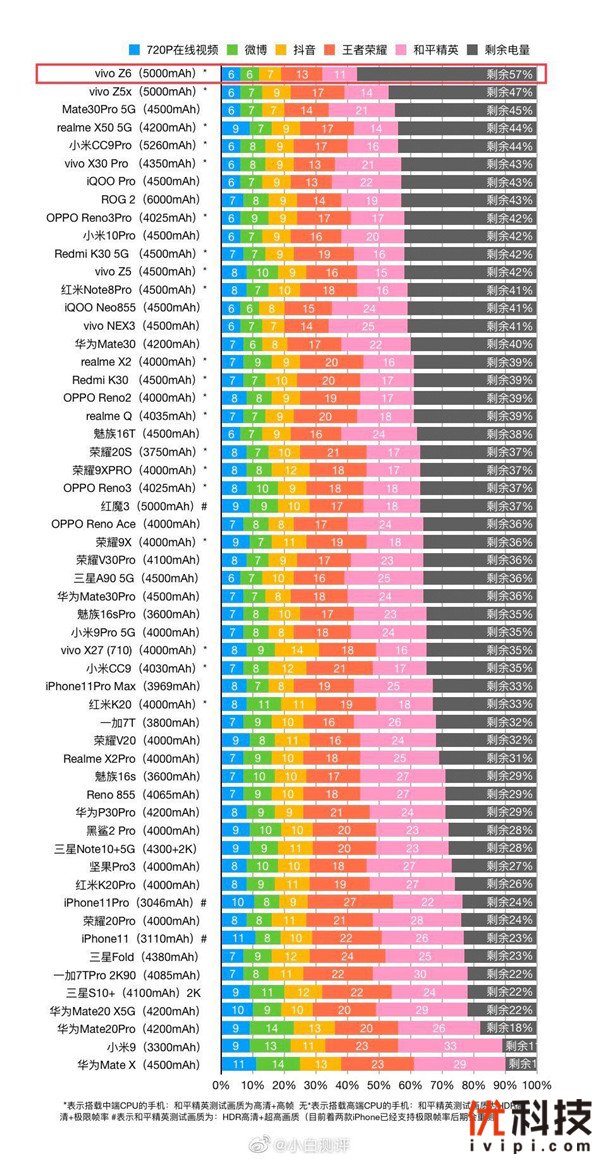 为了让用户在畅享5G体验时获得足够的安全感,vivo Z6采用了44W超快闪充与5000mAh大电池组合,用户利用零碎化时间即可让手机疾速回血。经过测试,配备了5000mAh超大电池的vivo Z6能在10分钟迅速回血至22%电量,65分钟即可充到100%。知名媒体也针对Z6的续航性能进行了测试,在经过五个小时的重度使用后,Z6仍剩余57%电量,续航能力在主流手机产品中排名第一[ 测试数据来自@小白测评]。强大的续航能力让vivo Z6无惧用户的全天候重度使用,助力用户轻松告别电量焦虑。