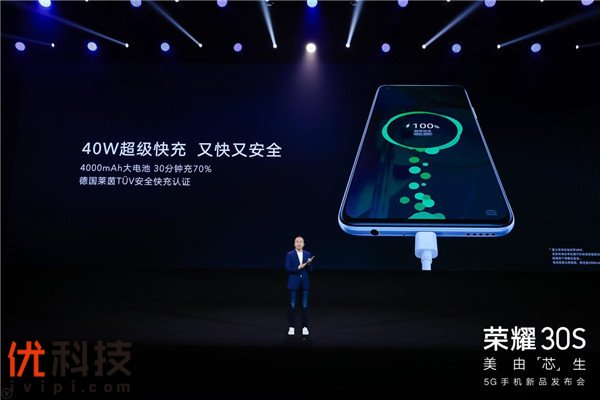 5G高速网络对智能机续航能力提出严峻考验。荣耀30S搭载有4000mAh大容量电池,足够满足一整天的日常使用所需。同时,荣耀30S标配莱茵认证40W超级快充,充电更安全,30分钟便能充到70%电量,续航持久在线,让用户可以就此告别续航焦虑,尽享5G时代。