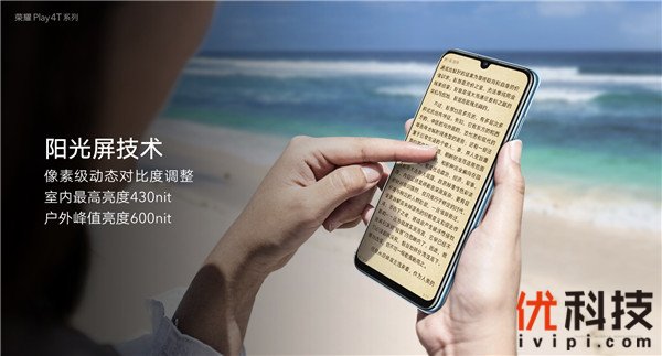 荣耀Play4T Pro配备的这块6.3英寸AMOLED珍珠屏,分辨率达到2400*1080 FHD+级别,PPI 达到418,并且拥有98%广色域、70000:1超高对比度,显示细腻画面丰富。值得一提的是,荣耀Play4T Pro也加入了阳光屏技术,峰值亮度可达600nit,即便是在户外也能看清屏幕内容。另外,荣耀Play4T Pro也经过德国莱茵TUV护眼认证,过滤屏幕蓝光,减少视觉疲劳。