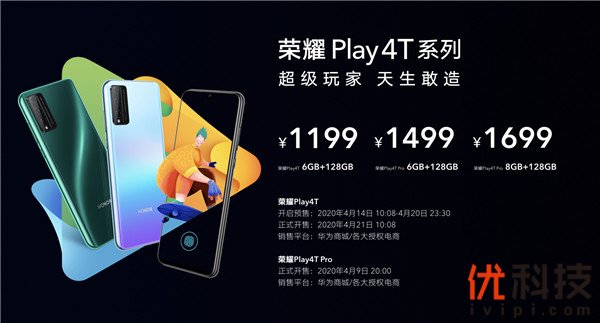 荣耀Play4T Pro有蓝水翡翠、冰岛幻境、幻夜黑三种潮酷配色可选,6GB+128GB版售价为1499元, 8GB+128GB版售价为1699元;荣耀Play4T有蓝水翡翠、幻夜黑两种配色可,6GB+128GB版售价为1199元。其中,荣耀Play4T Pro于4月9日20:00正式开售,荣耀Play4T将在4月14日10:08-4月20日23:30预售,并在4月21日10:08正式开售。
