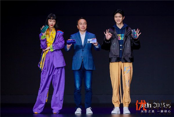 荣耀总裁赵明和超模金大川、吴佳烨展示荣耀30系列手机