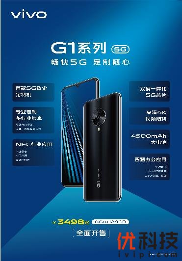 2020年5月7日,vivo首 款G系列政企5G商务办公手机正式开售,售价3498元起。G1作为vivoG系列首 发产品,其搭载的行业深度定制的双域系统将工作和个人生活完全隔离成为两个操作空间,在保留丰富便捷的生活应用的前提下,又保证了工作内容的信息安全。同时,vivoG1还支持多功能NFC、高度集成的卡证识别系统、“银联合作”安全的便捷支付、高清四摄的影像系统、智慧高效的语音助手等功能,具有成为政企人士生活与工作的“双重助理”的潜力。