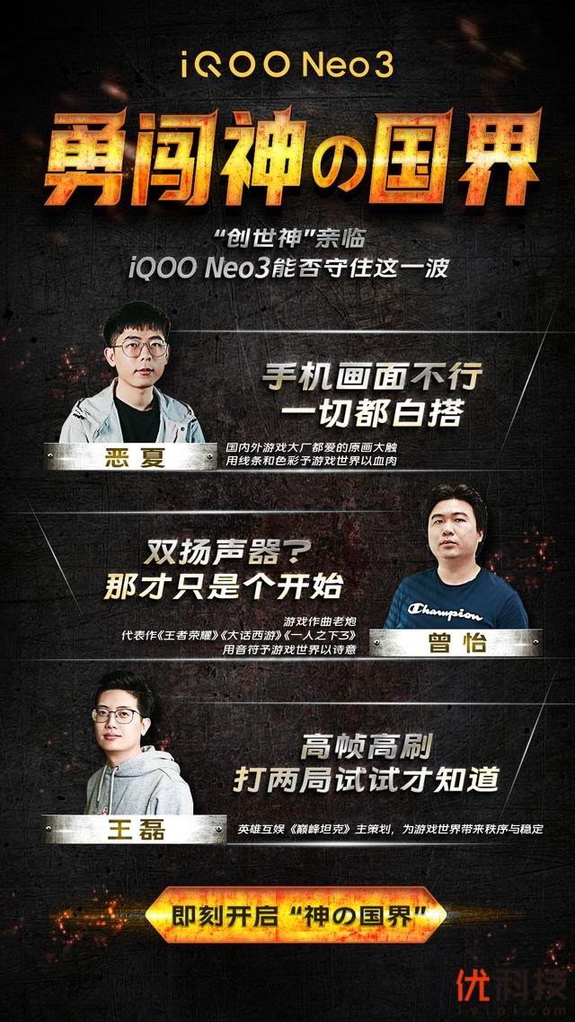 这次,iQOO 通过实地探访,找到了这些游戏的"创世神":原画大师恶夏、游戏作曲老炮曾怡、《巅峰坦克》主策划王磊,为大家带来 #iQOO Neo3 生而为赢#勇闯"神的国界"创意测评。iQOO Neo3 配备骁龙 865 处理器、UFS 3.1 超快闪存、144Hz 高刷新率竞速屏、立体双扬等超强配置,通过了 KPL 比赛用机测试认证,性能强悍及游戏体验超爽。