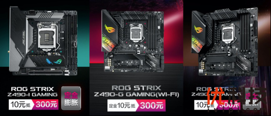 电竞硬装ROG STRIX Z490-F GAMING配备高效整合式供电设计和全面的散热解决方案,能够带来更好的游戏性能,预售价2799元,现在10元定金即可抵300元现金,行动起来!https://item.jd.com/100012943472.html;还有热门人气ROG STRIX Z490-HGAMING主板,配置强大,采用经典红黑配色,预售价2399元,1元即可抵100元,抓紧预定。https://item.jd.com/100007074511.html