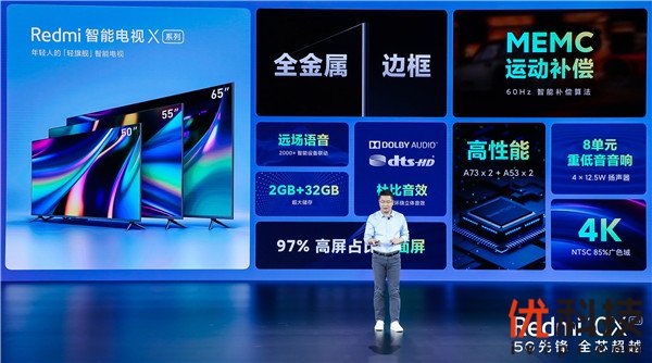 Redmi新推出的X系列智能电视,是为年轻人打造的「轻旗舰」智能电视,共有50、55、65英寸三大黄金尺寸。X系列拥有高画质:全系采用屏占比高达97%的4K全面屏,85% NTSC广色域,能够展现出比普通电视更多的色彩和生动细节,带来更沉浸的观影体验。标配之前只有高端产品才会使用的60Hz MEMC运动补偿技术,让球赛等运动画面更流畅、连贯,避免模糊拖影;高性能:搭载Novatek高端4核电视专属芯片,强劲的性能可以实时场景识别优化,带来更高的画质呈现。2GB四通道高速内存 + 32GB大容量闪存组合,确保运行流畅的同时,也为用户提供了更大的后续拓展空间;高音质:X系列配置8单元4扬声器音响系统,实现4×12.5W超大功率输出,支持Dolby和DTS音频双解码,2个全频和2个高频扬声器,呈现丰富的声音层次和细节,4个被动低频扩散器使低音浑厚震撼,提供影院般音效享受。