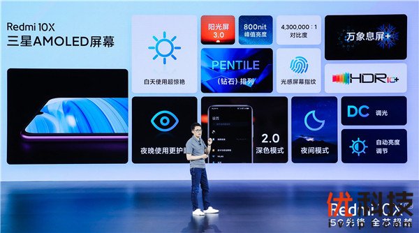 相较于同价位产品在技术运用上的落后,Redmi 10X系列坚持新锐科技的运用,全系标配三星AMOLED屏幕,支持屏幕指纹识别和万象息屏。内置震动反馈更有力的线性马达,IP53防水防尘,双面康宁GG5玻璃,对机身四角加厚防护,提升抗摔性。内置4520mAh大容量电池,Redmi 10X支持22.5W快充,Redmi 10X Pro升级为33W疾速闪充,并支持全功能NFC。Redmi 10X系列共四种配色,其中,胧月金采用AG磨砂工艺。Redmi 10X系列完美适配MIUI12系统,独有的超级壁纸功能解锁即可开启火星穿越之旅,全局自由窗口从容处理多任务,照明弹、拦截网、隐匿面具实现对用户个人隐私数据的全方位守护。