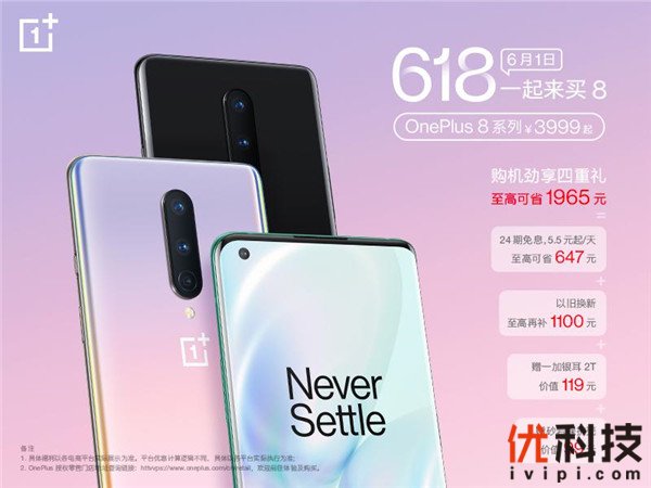 6月1日,每年一度的618年中大促正式拉开帷幕,一加 8 系列迎来开门红,全系全网销售额现已破亿。6月1日当天用户购买一加 8 系列可享“四重礼”,最高可省1965元:在京东、天猫、苏宁、分期乐平台享24 期免息,每天仅5.5元/起;以旧换新可享最高再返1100元福利;此外,购买一加 8 系列手机即可获赠砂岩手机壳和一加银耳 2T。