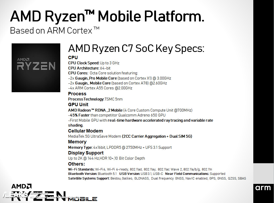 具体来看,这款参数过于美好的芯片采用了台积电 5nm 工艺制造,并且基于 ARM 最新架构,由 2 颗 Cortex-X1 + 2 颗 Cortex-A78 + 4 颗 Cortex-A55 的组合构成,拥有 8 核心设计,这不仅完全满足下一代旗舰 SoC 的水准,也符合 AMD 一贯的高性能特色。而在基带方面,曝光信息透露 Ryzen C7 将与联发科携手合作,引入最新的 MTK 5G 基带,另外在其他规格上,Ryzen C7 支持 LPDDR5 内存、UFS3.1 闪存、144Hz 刷新率、2K 分辨率、HDR10+ 和 10bit 色彩显示等技术。