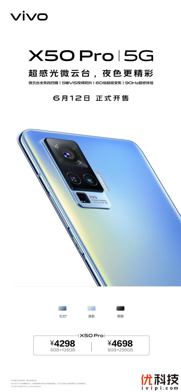 目前,vivo X50 Pro专业影像旗舰已在vivo官网、vivo京东自营官方旗舰店、京东vivo官方旗舰店、天猫vivo官方旗舰店、vivo手机苏宁自营旗舰店、天猫苏宁易购官方旗舰店、拼多多、分期乐、唯品会、招商银行掌上生活、平安口袋银行APP、vivo体验店专卖店、vivo终端各大门店等线上线下渠道正式开售, 8GB+128GB版本售价4298元,8GB+256GB版本售价4698元,换机用户可以考虑入手了。