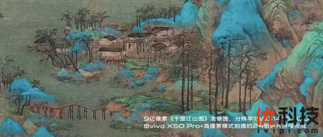 可以完成这种看似不可能的极限挑战,与X50 Pro+的旗舰配置有着很大的关系。X50 Pro+最高可支持1亿像素拍照模式输出,分辨率可以达到11536*8690。高像素的好处显而易见,一方面可以给照片的后期留有富余空间,另一方面不管是喷绘还是裁剪,高像素应付起来更加随心随遇。而这幅9亿像素的《千里江山图》就是在24张图片拼接下完成的,山川江河、野渡渔村、水榭楼台、茅屋草舍每个细节都清晰可见。