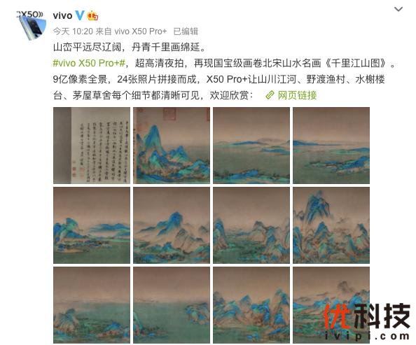 一部手机可以拍摄多大像素的照片?vivo官方微博给出了答案:9亿像素。“9亿像素全景,24张照片拼接而成,X50 Pro+让山川江河、野渡渔村、水榭楼台、茅屋草舍每个细节都清晰可见”。9亿像素、24张照片,将国宝级画卷北宋山水名画《千里江山图》完美呈现于电子屏幕之上,视觉感观超越纸质画布。而这,并没有动用专业的摄影器材,而是仅通过一部vivo X50 Pro+手机来完成。