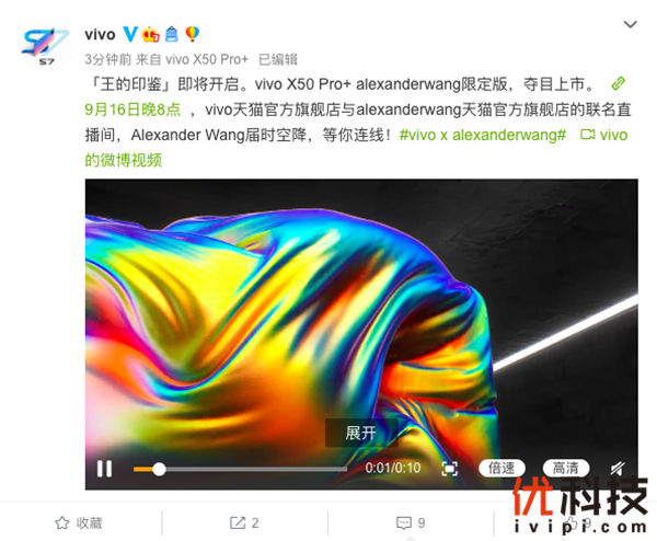 今天,vivo官方微博放出预热视频,继续为将在9月17日正式开售的vivo X50 Pro+ alexanderwang限定版手机打CALL:「王的印鉴」即将开启。9月16日晚8点,vivo天猫官方旗舰店将与alexanderwang天猫官方旗舰店进行联名直播,Alexander Wang届时空降,等你连线!据悉,vivo是alexanderwang品牌继宝格丽、宝马、阿迪达斯等国外品牌联名跨界合作后,第一个并且是迄今为止唯一一个中国品牌。同时,与alexanderwang的跨界合作也成为了vivo在时尚设计领域的又一次全新探索。