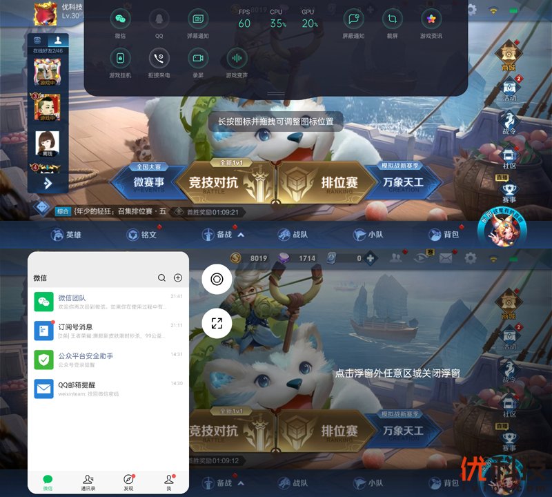 操作方面则是在游戏过程中仅需要从顶部两角向下滑动即可调出游戏空间,并可以在其中选择是否录屏、拒接来电、屏蔽通知,并且还具备弹幕通知功能,让微信、QQ、短信等消息在游戏期间也不再错过,避免了切换出去看消息回来凉凉的场面,同时还可以 设定弹幕速度以及透明度和同屏通知数量。另外还支持游戏时开启微信功能,边聊天边游戏也是一个不错的选择。