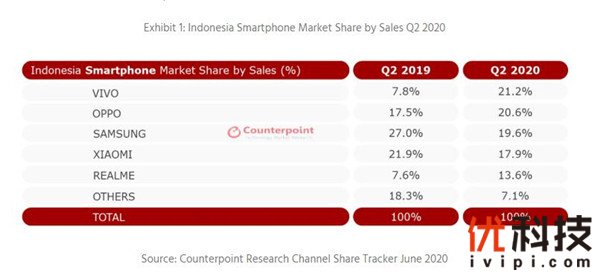 国际调研公司Counterpoint最新数据报告显示,国产厂商vivo在2020年第二季度继续领跑印尼智能手机市场,以21.2%的份额位居第一。抛开本土品牌,中国企业继续主导印尼智能手机市场,在前五大品牌中占据四席。