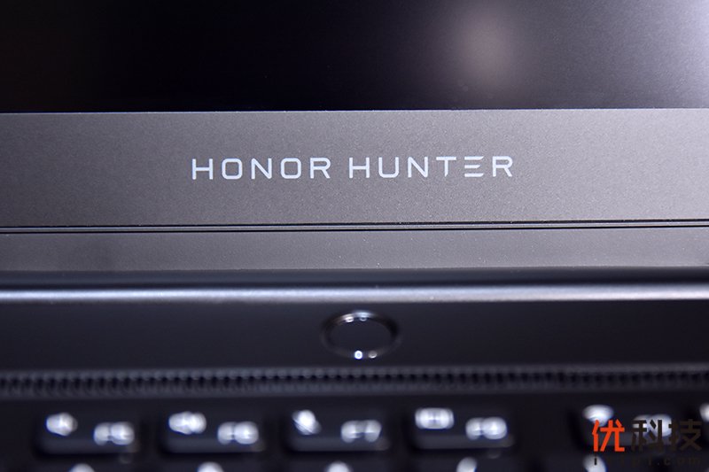 在屏幕下方为荣耀猎人的英文logo,虽然屏幕下方的边框看起来有点宽,但好处也是非常明显的,在笔记本的开启状态下提升显示区域,让屏幕和用户的面部保持平行,有效的避免了长时间使用对于用户颈部的压力。