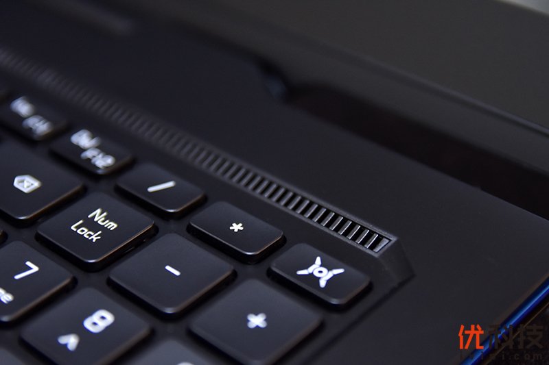 在荣耀猎人游戏本V700键盘的上方还有一条镂空开孔,以让键盘下面的内部空间进行通风,通过空气对流降低键盘表面温度。另外位于右上角配有独立的性能模式切换键,一键切换非常的方便。