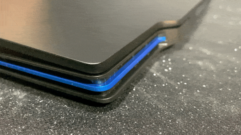 荣耀猎人游戏本V700左右两侧的散热口一直延伸到机身背部,形成了两个 90 度直角的包裹型散热设计,散热口中间还采用了一条蓝色的装饰带,内部集成了总共 240 片 0.1mm 的超薄散热片。