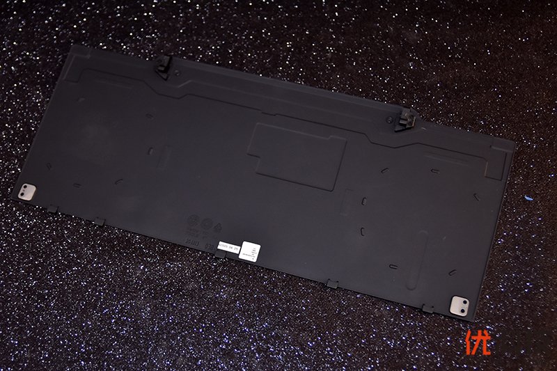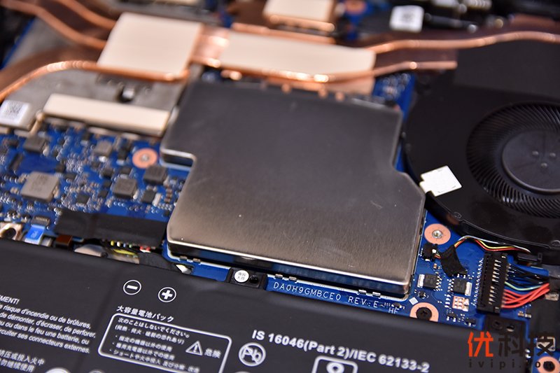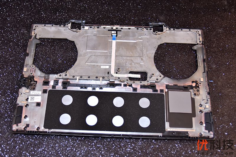 先来看一下D面盖板,同样采用金属材质,做工非常的扎实,内部可以看到灯带的排线,以及下方对应电池部分的缓冲泡棉以及PCIe NVMe SSD高速固态硬盘的散热贴。