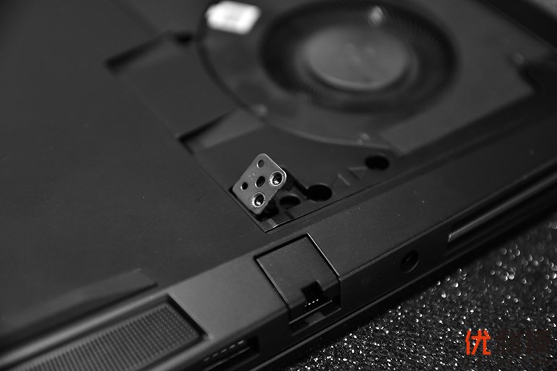 荣耀猎人游戏本V700的散热底板采用了金属材质,非常的纤薄,同样也很有韧性,底板下方采用四颗螺丝和机身固定,上部采用了双挂钩和笔记本转轴部分的升降式转轴连接。