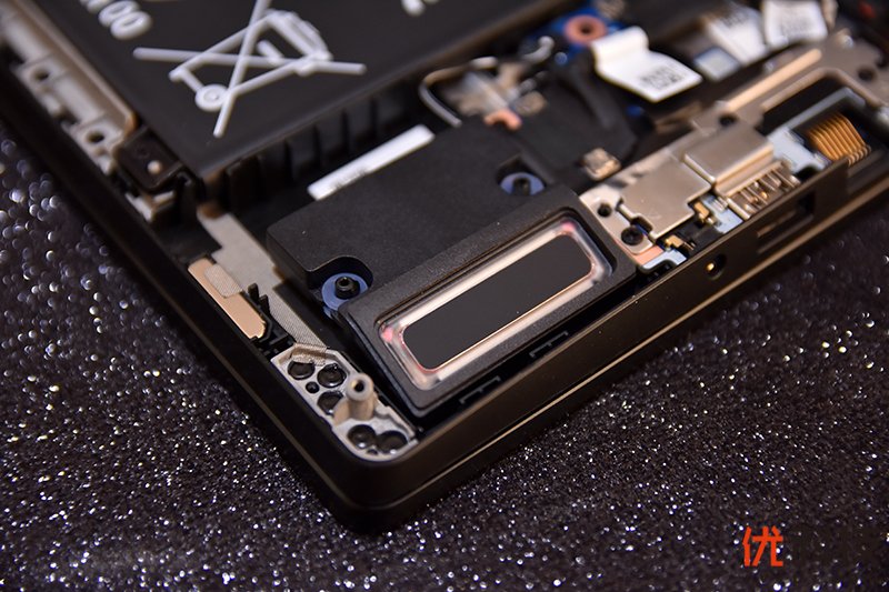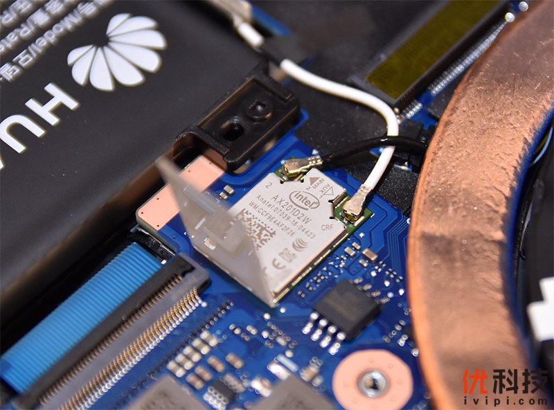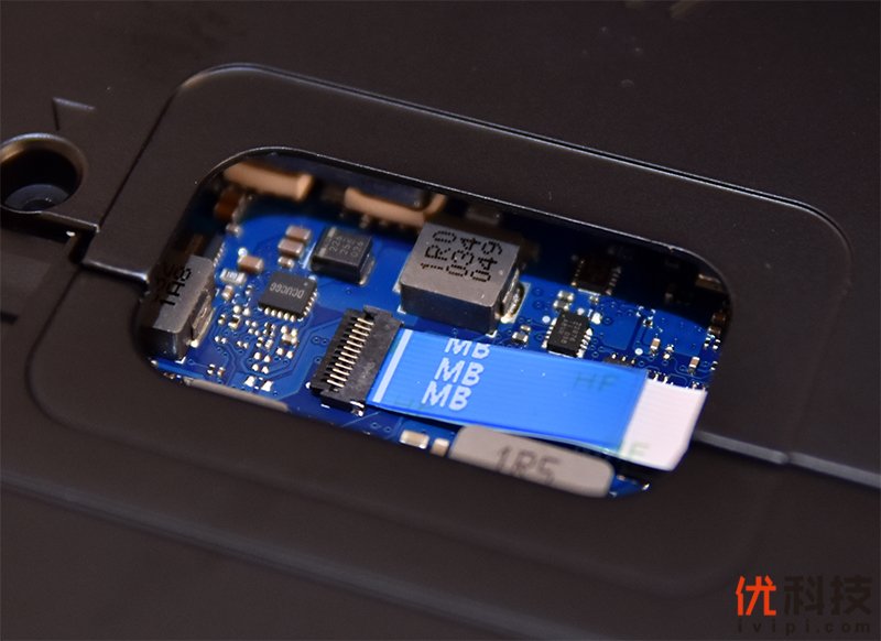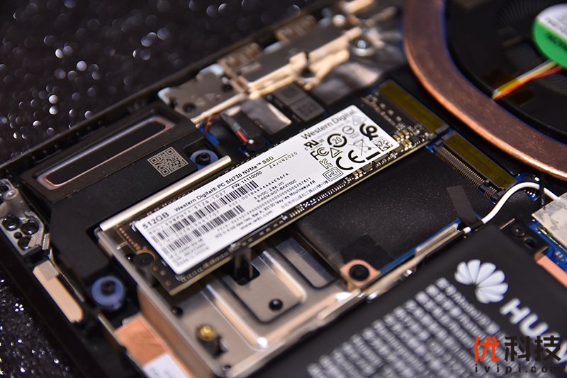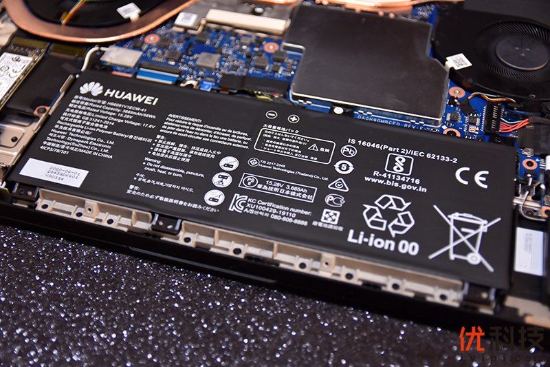 位于下方的则是内置的一块HUAWEI的56Wh电池,电池接口部分同样有所防护。