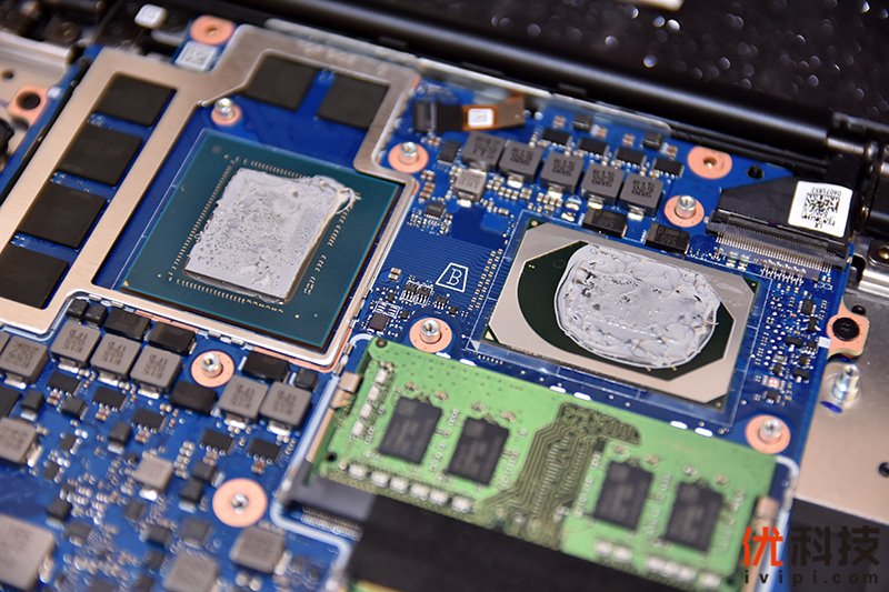 取下散热器后就可以看到下方的英特尔® 酷睿™ i7-10750H 处理器和NVIDIA® GeForce RTX™ 2060显卡,其中处理器和显卡表层都涂着较厚的散热硅脂。