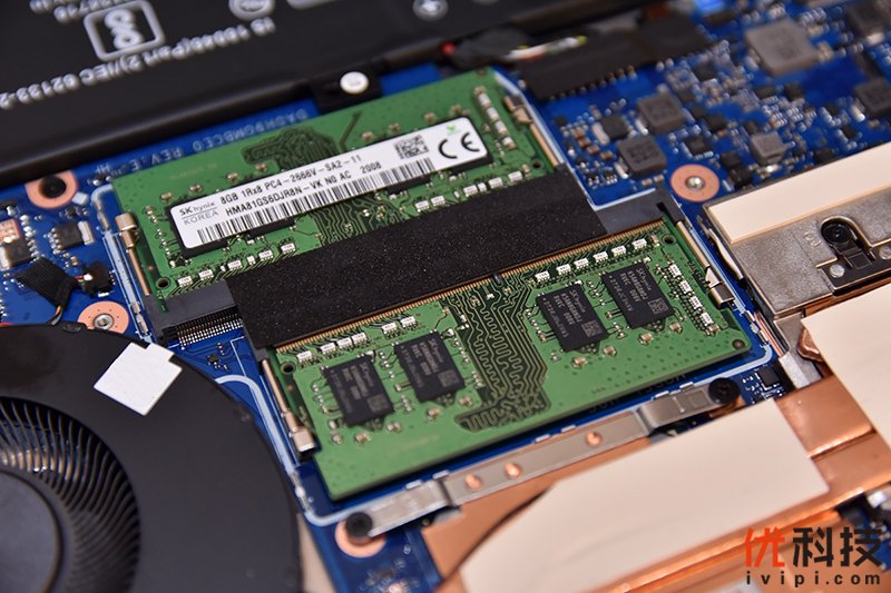 取下屏蔽罩,下方为两个内存插槽,出厂自带两条 8GB海力士内存,后续用户也可以根据自身的需求扩展内存。