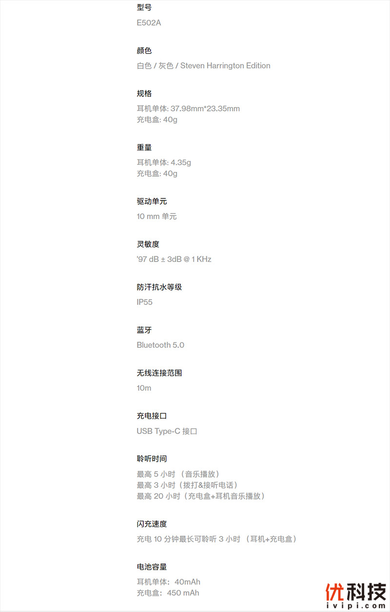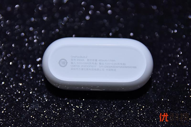 而在一加 Buds Z电池仓的底部则是标有一加 Buds Z的产品相关规格信息,标有额定容量450mAh电池容量以及输入输出规格信息。