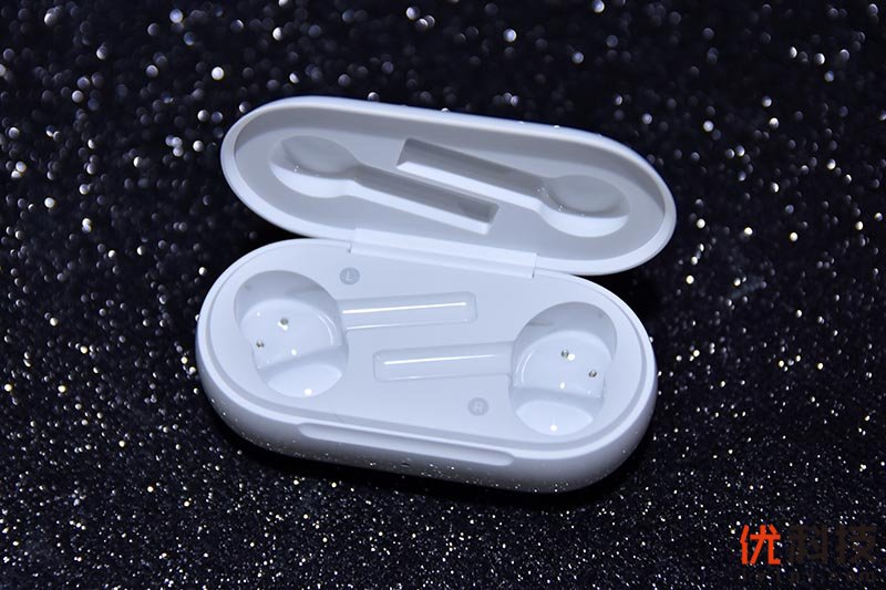 在取下一加 Buds Z耳机后可以看到内部分别有两颗充电触点,同时在耳机槽旁边还标有左右耳标识,便于用户的存放。同时电池仓上盖还采用了凹陷设计,可以很有效地降低了电池仓的整体尺寸,更加有效的便于携带。