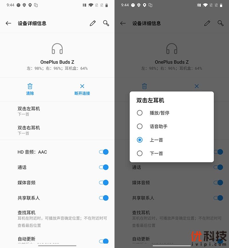 进入到手机的蓝牙功能选项中可以看到一加 Buds Z的实时电量,并且在设备详细信息中可以设定一加 Buds Z耳机的相关触控功能。并且支持音频选择以及功能选择等,非常的全面。