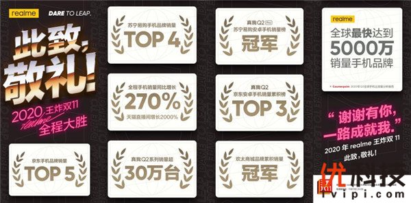 根据各大电商平台双11的统计数据,realme手机品牌销量在京东平台位列TOP5、苏宁平台位列TOP4,同时摘得多个电商平台同比增速冠军、欢太商城品牌累计销量冠军;真我Q2系列销量突破30万台,成为双11爆款。其中真我Q2 Pro斩获苏宁安卓手机销量榜冠军,真我Q2夺得京东安卓手机销量累积榜TOP3。