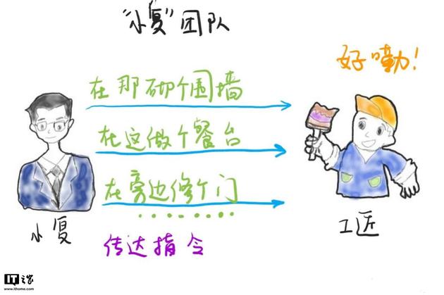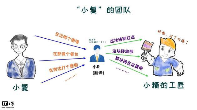 当 “小复”对工匠们说 “在这砌个围墙”时,工匠们不知道他说了些啥。“小 R”就帮工匠们把这句话分析、拆解,然后还是像 “小精”那样手把手告诉工匠每一块砖应该砌在什么地方。