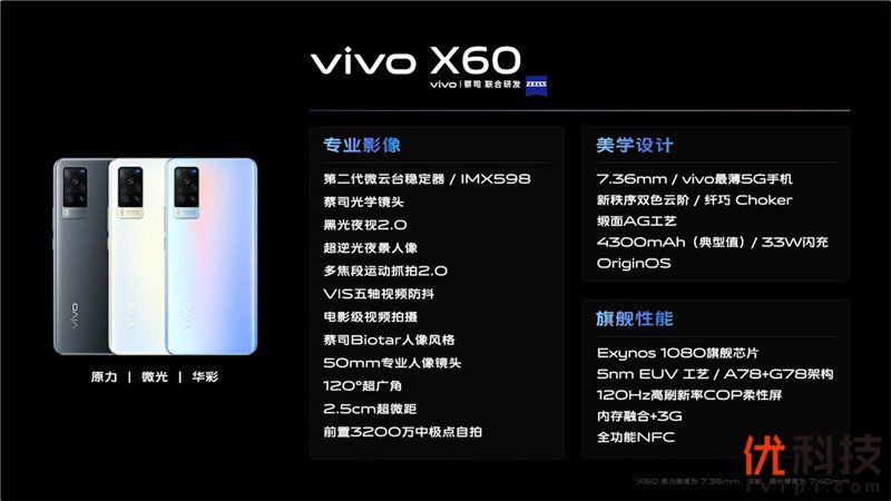 2020年12月29日,vivo专业影像旗舰手机X60系列正式发布。vivo X60系列携手蔡司,将蔡司在光学领域的深厚积淀应用到联合影像系统当中,结合vivo自身在移动产品生产制造方面的经验,共同打造了X60系列出色的成像素质,并且通过重新构建空间深度和光斑模型,X60系列再现了经典蔡司Biotar镜头梦幻的旋转虚化效果。同时,vivo X60全系标配第二代微云台,最大进光量提升16.8%,夜色更精彩。vivo X60系列设计理念以“回归本原”为出发点,即符合X系列用户审美偏好,也传递了X系列的人文之美。
