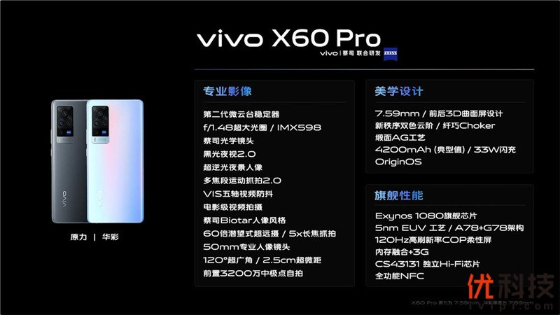 配色方面,vivo X60系列提供原力、华彩和微光三两种方案,呼应整机“复苏”设计主题的同时,也传递着温暖、宁静、新生的情感基调。