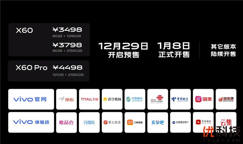 vivo X60系列手机已在vivo官网、vivo京东自营官方旗舰店、京东vivo官方旗舰店、天猫vivo官方旗舰店、vivo手机苏宁自营旗舰店、天猫苏宁易购官方旗舰店、拼多多、分期乐、唯品会、招商银行掌上生活、平安银行口袋商城、交通银行买单吧、vivo体验店专卖店、vivo终端各大门店等线上线下渠道开启预售。预售至高享24期分期免息,并加赠半年碎屏宝和半年延保。 1月8日,vivo X60系列正式开售,敬请关注。