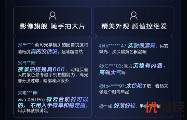 用户方面认为,vivo X60系列作为一台影像旗舰手机,具备随手拍大片的强悍实力;精致的外观则是颜控们的绝爱。性能方面,vivo X60系列也具备“性能领先、快人一步”的实力,而首发搭载的OriginOS则更加贴心便捷。