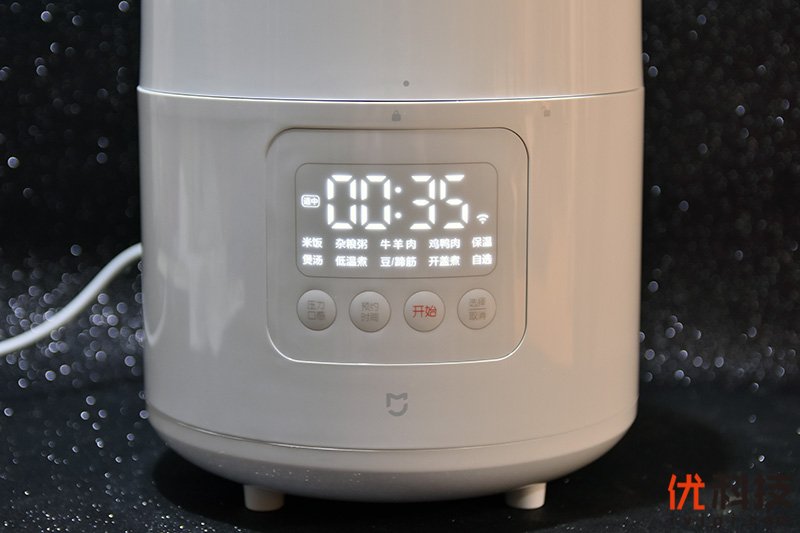 正面设计方面,米家智能电压力锅2.5L有着大尺寸的显示屏设计,其中四个独立按键分别为“压力口感”“预约时间”“开始”“选择/取消”,而在上方的显示屏中则是提供了米饭、杂粮粥、牛羊肉、鸡鸭肉、保温、煲汤、低温煮、豆/蹄筋、开盖煮以及自选功能,其中自选模式可以通过连接米家APP来无限扩展,其中时间显示尺寸非常大,用户站在厨房门外也可以一眼了解到剩余时间。另外在正面的上沿部分还标有锁定和解锁两个提示点,用户可以根据提示点对应了解到米家智能电压力锅2.5L是否盖严。