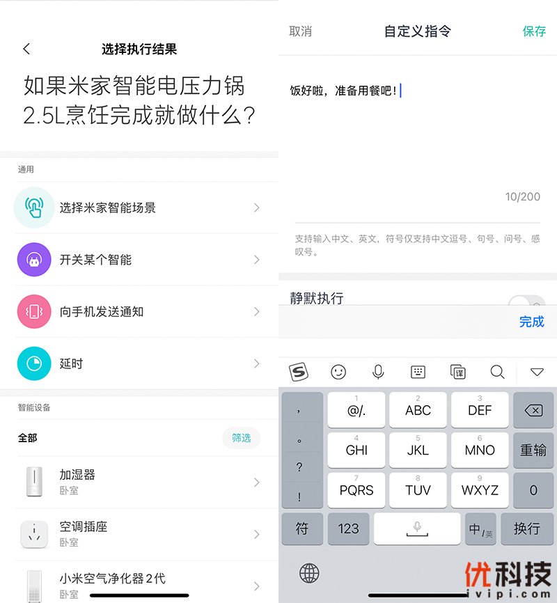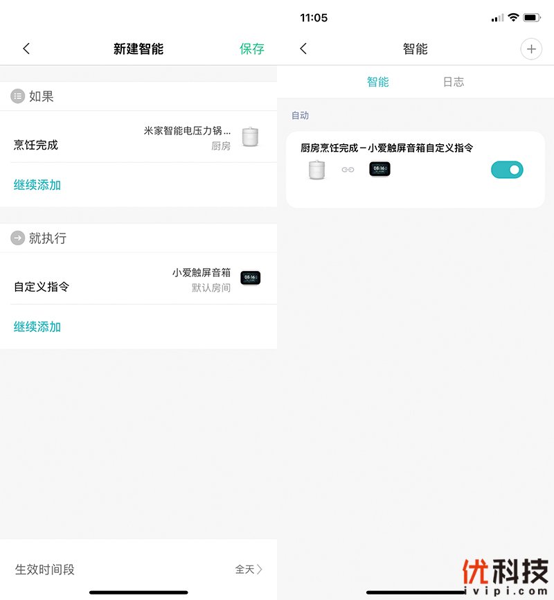 其中智能场景可以联动家中的小爱触屏音箱,设定起来也是非常的简单,并且支持自定义指令。