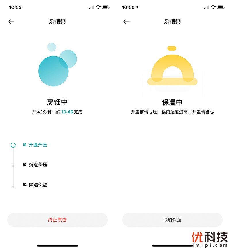 至于烹煮操作中客户端的界面也是非常的细致,将烹饪总时长以及完成时间都提示在页面中,并且米家智能电压力锅2.5L的烹饪流程均有提醒,而且烹饪完成的保温中时,页面还具有提示用户开盖前请泄压。