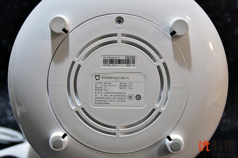 米家智能电压力锅2.5L的底部采用了四脚设计,其中两脚配有防滑胶垫,而中间则为大尺寸的环形散热孔,同时米家智能电压力锅2.5L的相关规格信息贴纸则是位于正中。