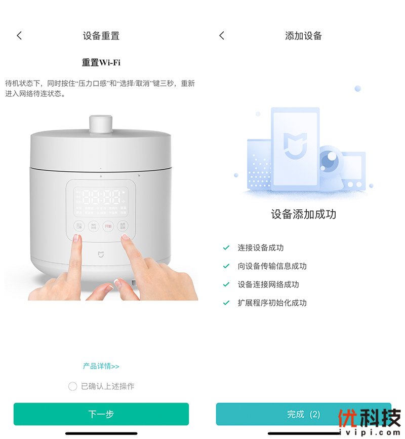 米家智能电压力锅2.5L已介入米家系统,支持小爱同学控制,在用户使用之前可联入家里的智能家居系统。至于操作起来也是非常的方便,首先在通电待机状态下,同时按住“压力口感”和“选择/取消”按键三秒,重新进入网络状态进行联网,然后在米家手机端即可看到设备添加成功。