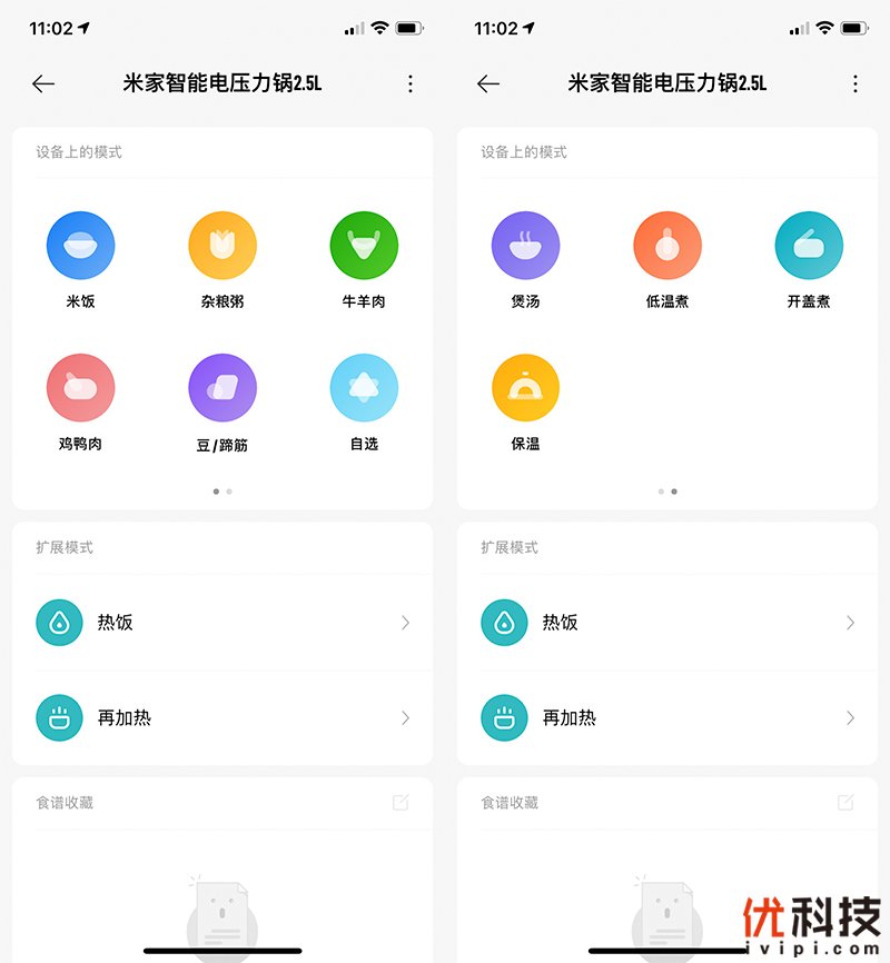至于米家智能电压力锅2.5L的客户端操作页面也是非常的简单,上方功能区为左右滑动式设计,内含多种工作模式。而中间则为扩展模式,分别为热饭和再加热。至于底部则是食谱收藏专区,便于存放用户喜欢的食谱,易于操作。