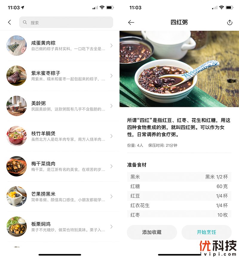 关于米家智能电压力锅2.5L的智能食谱则是非常的全面,例如粽子、粥、煲汤、肉类等都有详细的介绍,至于食谱内部也是非常的详细,包括分量、保压时间以及准备食材均有列出。并且还支持用户自创食谱,通过用户自定义选择食材、做法以及保压时长来创作新的美味。