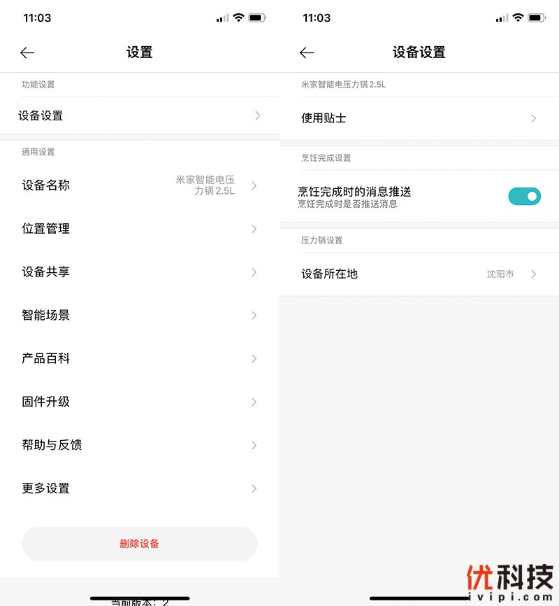 而在设置功能内可以设定米家智能电压力锅2.5L的部分功能,例如位置管理,设备共享,智能场景以及固件升级等等,非常的全面。