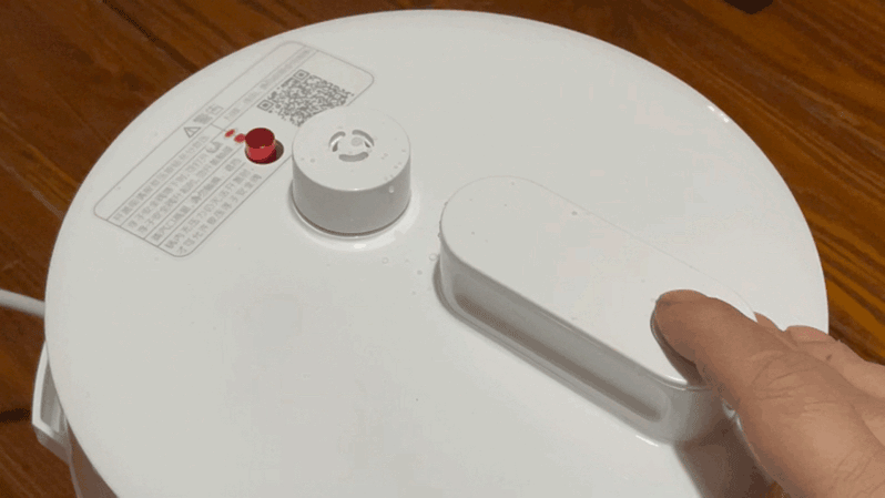 当屏幕的倒计时显示结束并伴随着小爱触屏音箱的提示后,可以看到米家智能电压力锅2.5L锅盖上的浮子安全阀升起,此时锅盖处于锁定状态,需要先按泄压按钮通过排气阀泄压,在经过数次泄压之后可以看到红色的浮子安全阀回落,此时可以旋转锅盖开启了。