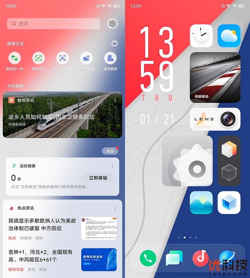 本次OriginOS for iQOO的通知中心和控制中心采用了分屏操作设计,例如从顶部镜头左侧下滑为通知中心,镜头右侧下滑则为控制中心。而若从主页面下滑则为搜索中心,其中匹配了应用建议以及热门搜索,便于用户实时了解最新时态。另外系统内的原子通知则是具备了强悍的功能,其与桌面上的时间组件整合,帮助用户在众多信息的下拉通知中,将最重要的信息精炼出来,并展示在2*1这个极限的空间范围中。关于控制中心设计的也是非常的有个性,采用了多色搭配,更加的醒目,同时在系统内还可以选择多样的控制中心主体样式。
