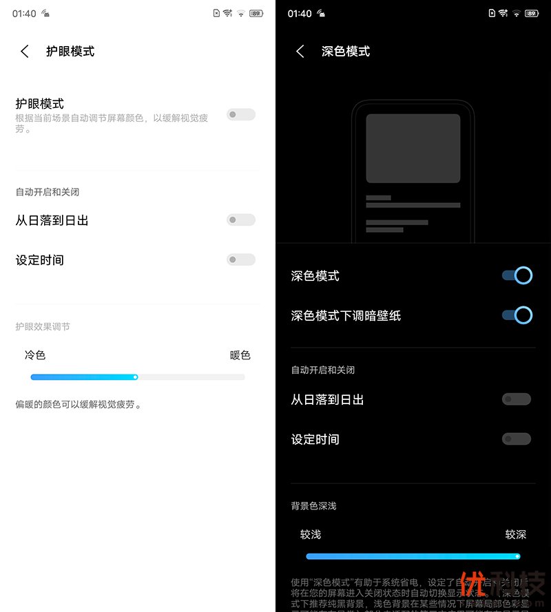 系统内还支持全局护眼功能,可以有效的保护视力,并且还支持定时开启,例如可以选择在夜晚来临之前自动开启全局护眼以保护视力。同时得益于采用了AMOLED显示屏,在系统内还可以选择深色模式来节省功耗,其中深色模式也支持定时开启,并可以手动调节深色模式的色彩深度。